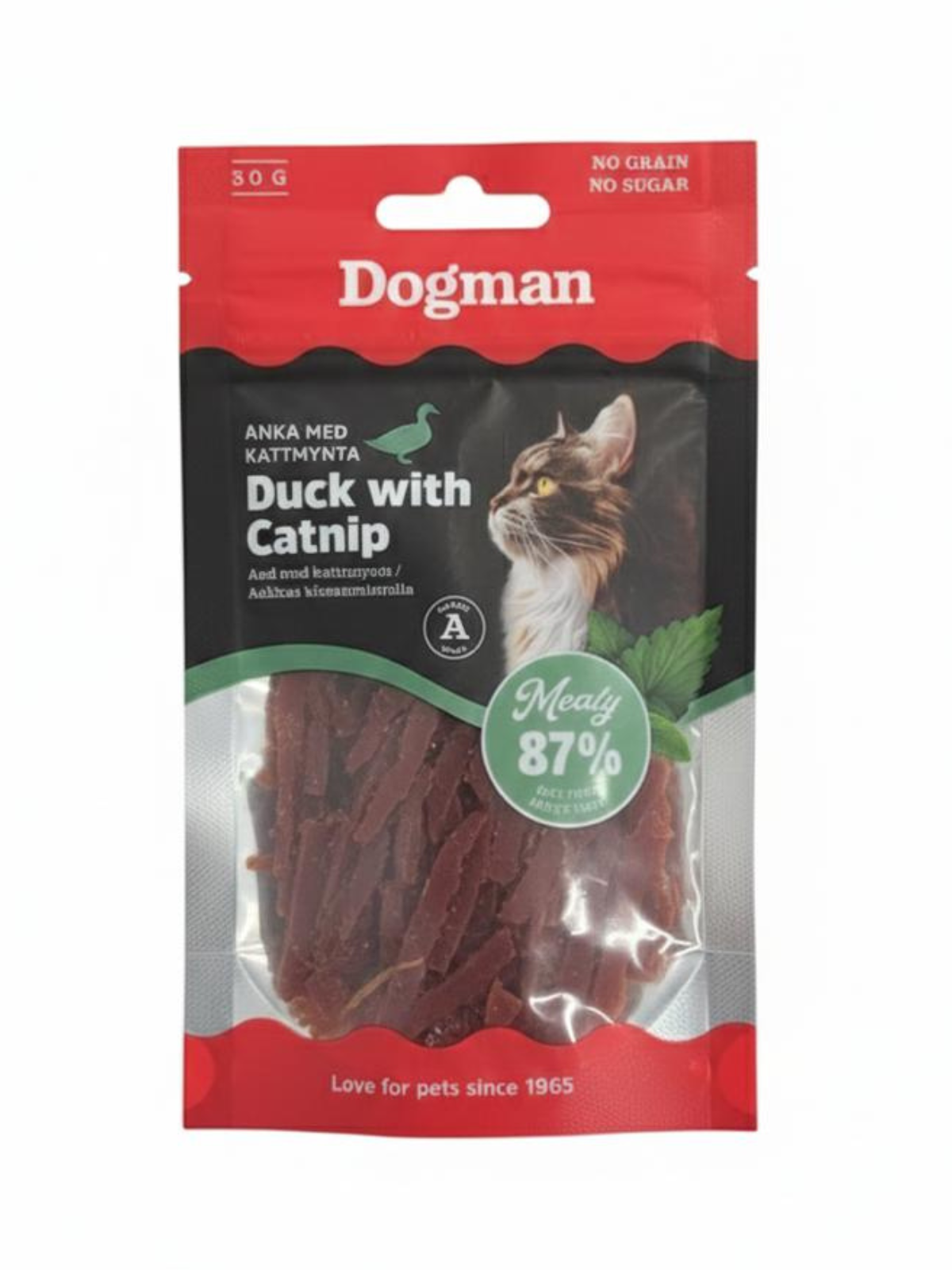 وجبة فاخرة للقطط تحتوي على نسبة عالية من لحم البط اللذيذ وسمك القد اللذيذ. بالإضافة إلى عشبة النعناع البري المفضلة لدى القطط! بدون سكر أو حبوب مضافة. يُقدم كمكافأة مع نظام غذائي متوازن.